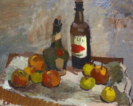 Stilleben med frukter och flaskor.