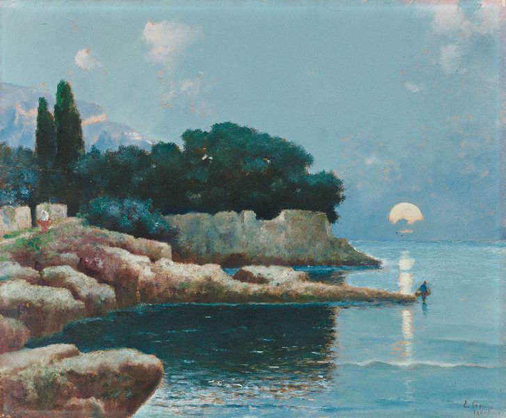 Sonnenaufgang über malerischer Bucht mit Fischern am Strand.