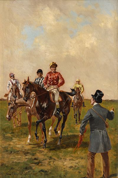 Vier Jockeys auf dem Reitplatz mit Besucher sprechend