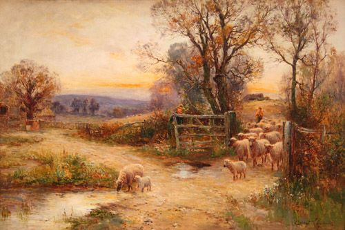 Shepherds and Flock of Sheep entering a Field through a Bar Gate