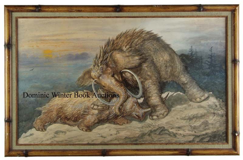 | Fighting mammoths in a prehistoric landscape with setting sun | |