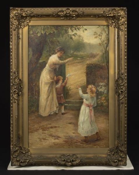 A Mother and Her Children Waving Goodbye to the Departing Soldiers