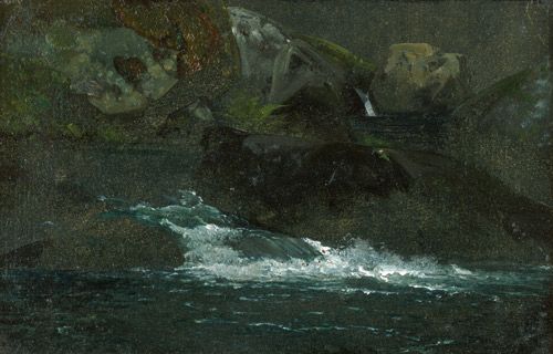 Skizze eines kleinen Bachlaufs mit moosbewachse...