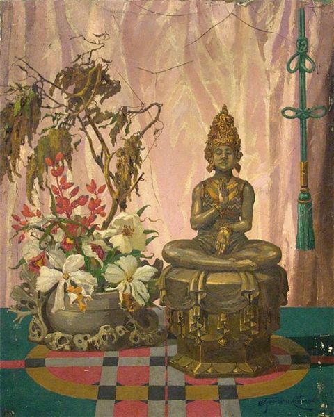 Stillleben mit Blumengesteck und Buddhaskulptur