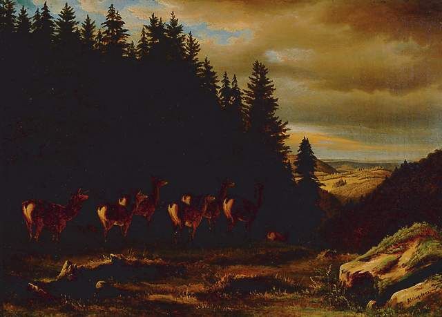 Rotwild vor Tannenhain auf dem Weg in Tal, Dämmerung