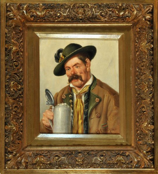 Portrait eines Herrn in Trachtenjacke und mit Bierkrug