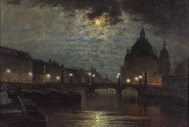 De Friedrichsbrug met de Dom te Berlijn bij maanlicht