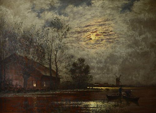 Nattlandskap med vattendrag, byggnader och ekor nedanför fullmåne.
