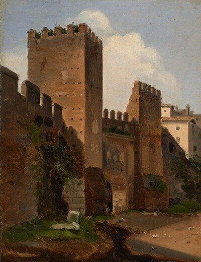 | Vue de la Porte Tiburtine du mur d'Aurélien à Rome | |