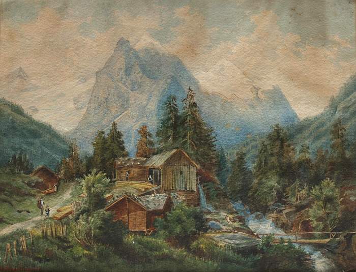 Blick auf ein Gebirgstal mit Berghütte vor schneebedecktem Gebirgsmassiv