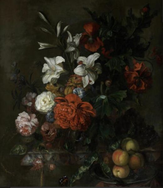 | Poppies, lilies, roses and other flowers in a glass vase on a draped marble ledge, with peaches on a pewter dish, a butterfly an | |