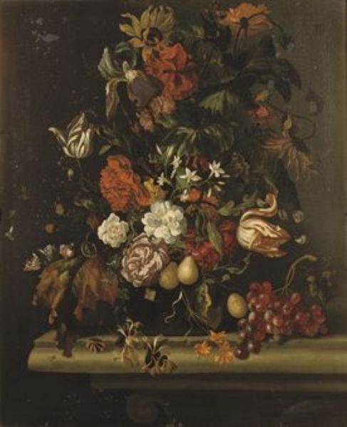 | Tulips, irises, carnations and other flowers in a glass vase, together with grapes on a stone ledge | |