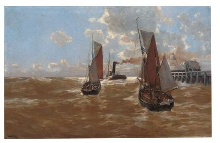 Schiffe in bewegter See vor Ostende mit Mole und Leuchtturm.