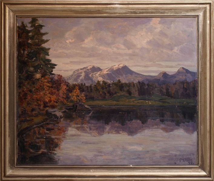 | Herbstliche Partie in den Voralpen. In einem See spiegeln sich die bereits verfärbten Bäume. Im Hintergrund die Höhenzüge der Al | |