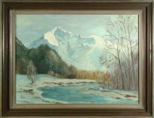 | Winterliche Landschaft in den bayerischen Alpen. Im Vordergrund schlängelt siche ein Fluss durch das baumbestandene, verschneite | |