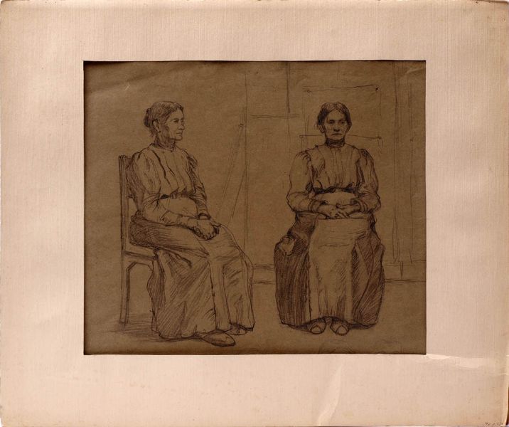 Zwei Personenstudien. Auf einem Stuhl sitzende ältere Bauersfrau aus verschiedenen Blickwinkeln