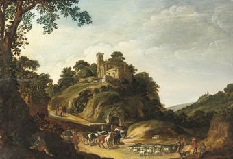 A rocky wooded landscape with Christ on the Road to Emmaus