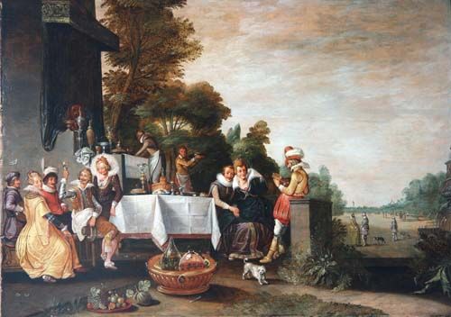 | Vornehme Gesellschaft mit Lautenspieler, im Hintergrund Blick in weite Parklandschaft | |