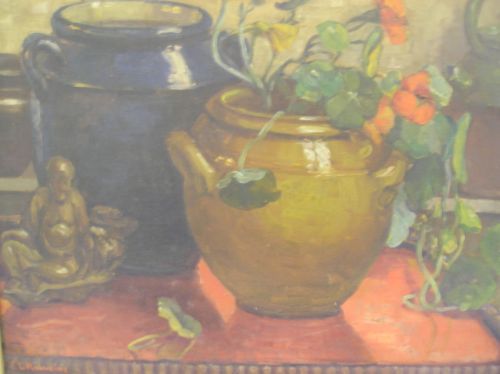 Still life of nasturtiums in a glazed earthenware pot