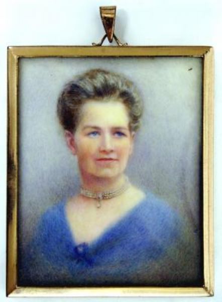 | Portrait of Marion Kennaway, half length in a blue dress and pearl necklace | |