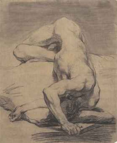 | Académie d'homme nu, allongé, vu d'en haut (recto); Académie d'homme assis tenant une plume et un livre, étude subsidiaire de sa | |