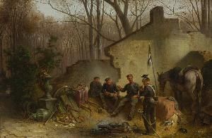 Rastende Ulanen in einer Ruine.