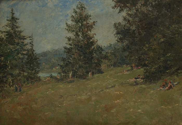 Waldlichtung mit Badesee und Personenstaffage