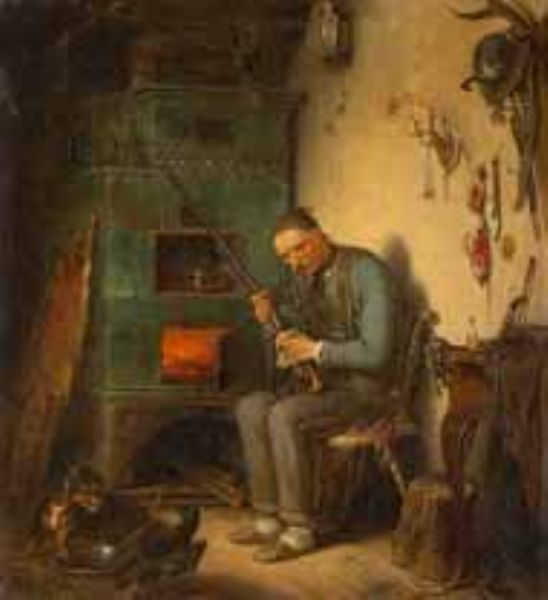Alter Jäger reinigt sein Gewehr in der Stube.
