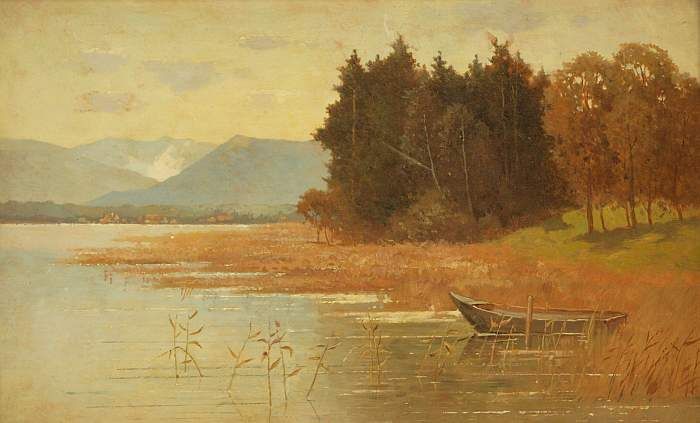Voralpensee mit Ruderboot in herbstlicher Landschaft.