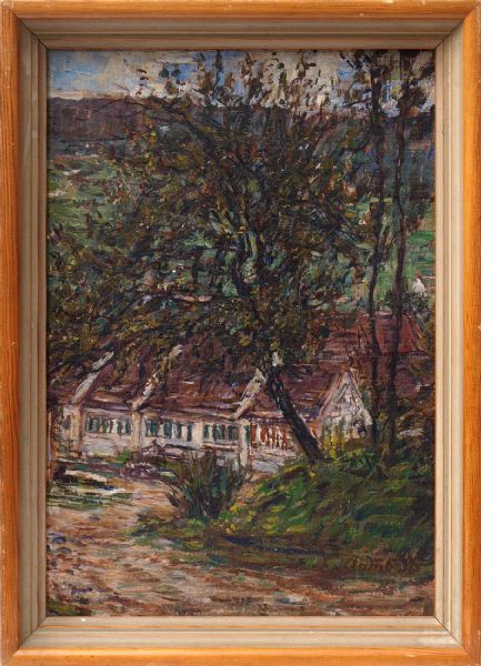 Baumgruppe in weiter Landschaft, im Hintergrund einige Häuser