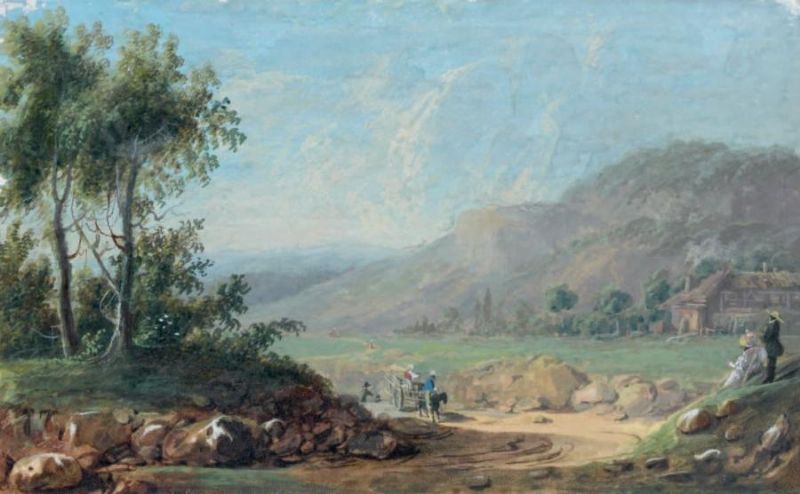 | Couple de promeneurs regardant une charrette de paysans sur une route de montagne | |