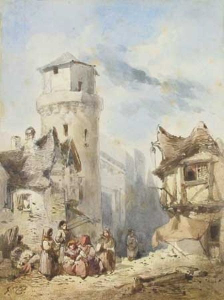 PERSONNAGES À L'ENTRÉE D'UNE VILLE MÉDIÉVALE
