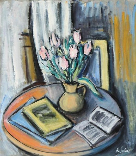 Still life with tulips and books