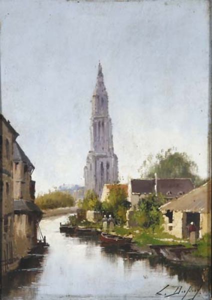 | Ammersfoort - La tour Notre Dame, Blick entlang eines Flussufers mit Häusern auf den Turm einer Kirche | |