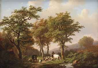 | A wooded landscape with a herdsman and his cattle on a track | |