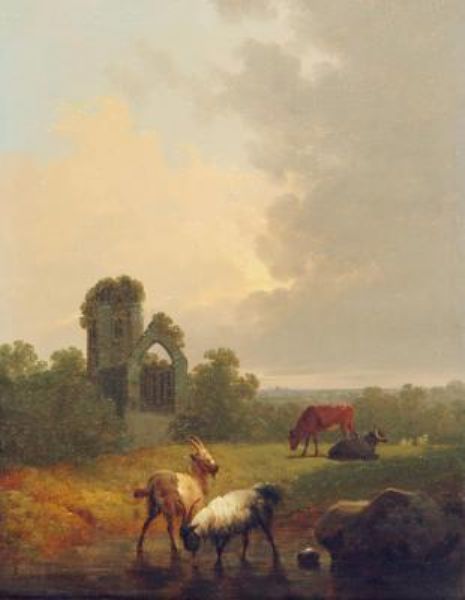 | Landscape with Goats watering, Cattle and Ruined Abbey Beyond | |