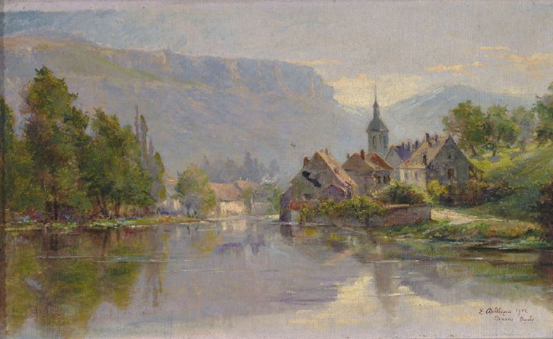 | Ornans Doubs. Malerische Flusslandschaft mit Kirchdorf und Berghintergrund | |