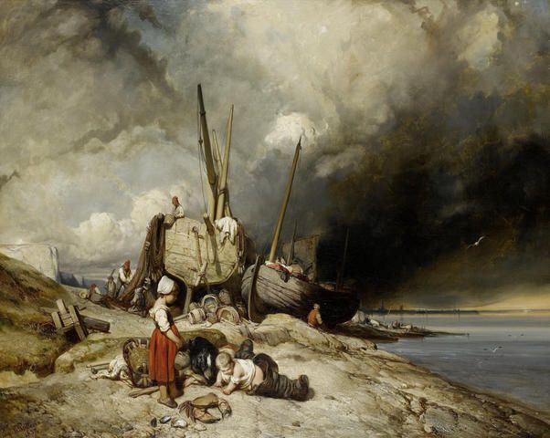 Fishermen and boats on the Normandy coast with children in the foreground