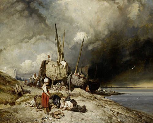 | Fishermen and boats on the Normandy coast with children in the foreground | |