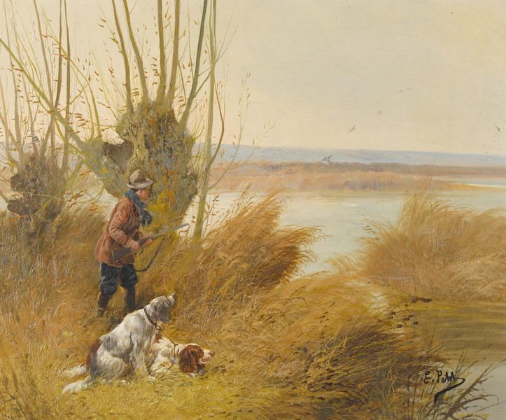 Der Jäger mit seinen Hunden auf der Pirsch.