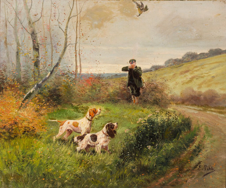Hunter duck hunting with two hunting dogs in autumn landscape