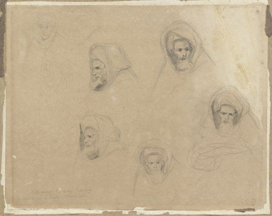 | Une feuille de cinq études de têtes du ministre Amin-Bias à Tanger ; une silhouette de musicien à gauche | |