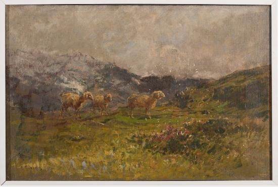DAYBREAK IN THE MOUNTAINS: LANDSCAPE WITH SHEEP.