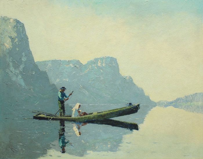| Tranquil bay scene with a man rowing a small boat and a seated woman nursing a child, mountains and cliffs in the background | |