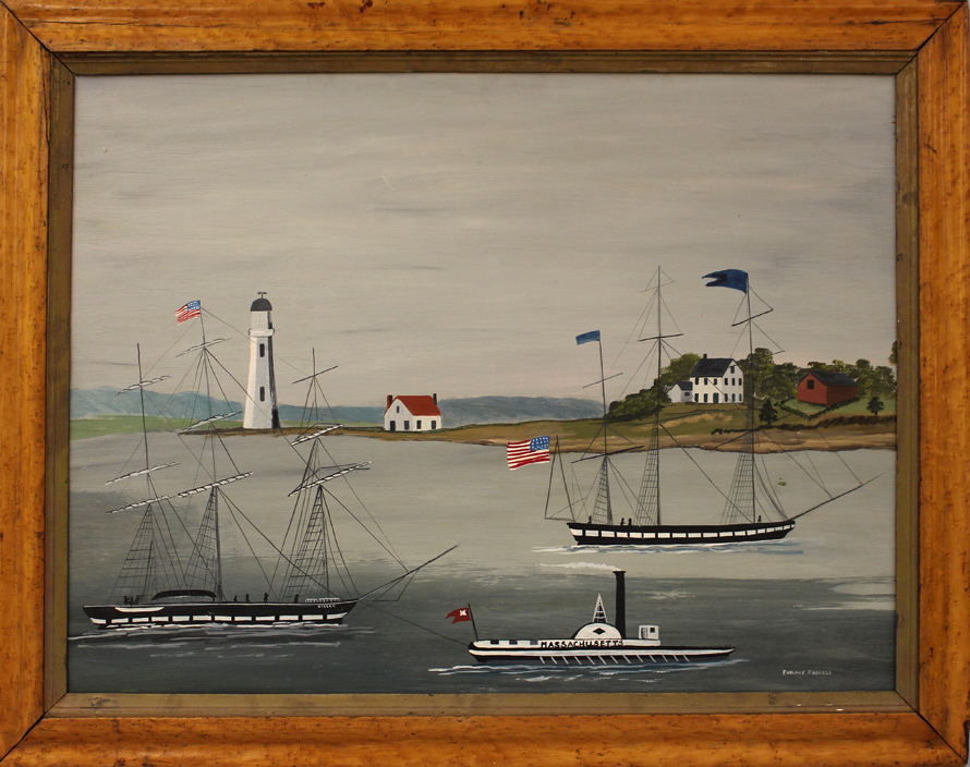 Massachusetts coastal view with lighthouse and ships