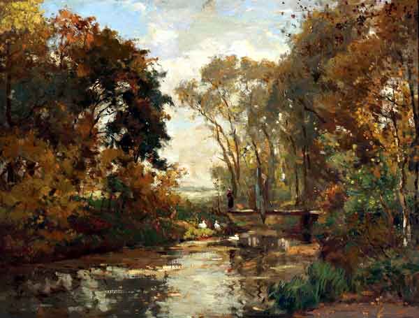 Bosgezicht met boerin op een bruggetje
