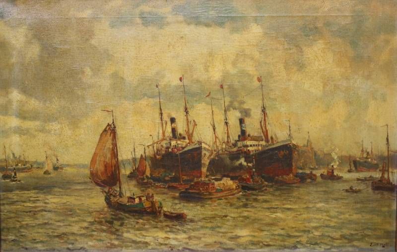 Schepen op de Maas voor het kantoor van de Holland Amerikalijn te Rotterdam