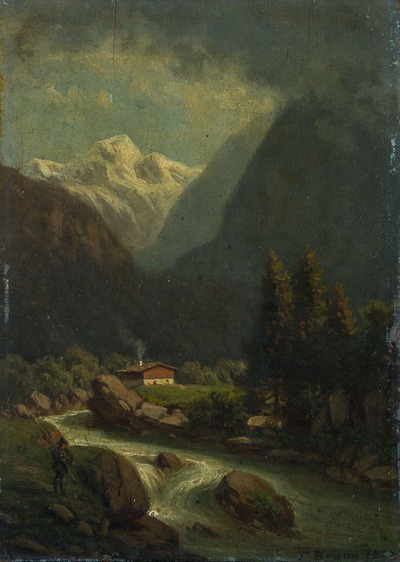 Schmales Gebirgstal mit Fluss und Hütte. In der Ferne schneebedecktes Bergmassiv
