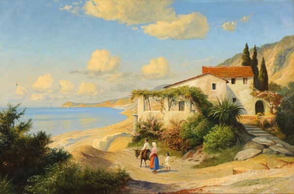 Italian coastal view with a woman and some children looking across the sea