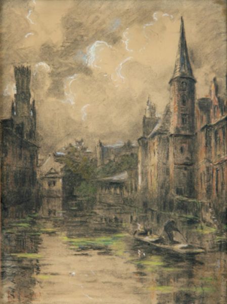 Stadtansicht mit Kanal und Booten, Kohle mit Farbkreide